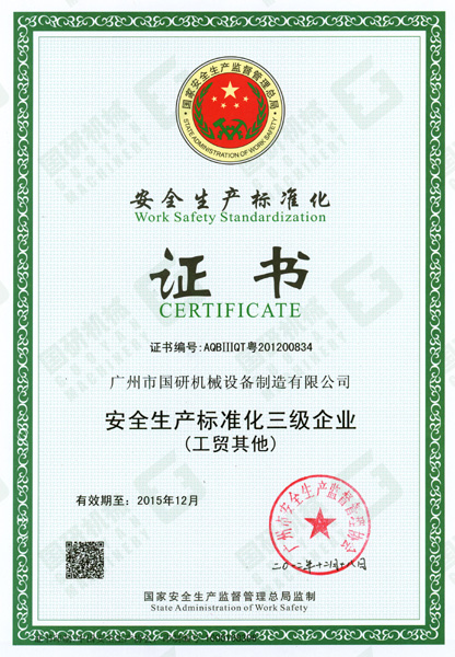 2012年12月24日,国家安全生产监督管理总局为拼搏网页登录公司颁发了《安全生产标准化企业证书》,这意味着我司已达到《广州市工业企业安全生产标准化评定办法》及《广州市工业企业安全生产标准化评定标准》的要求。