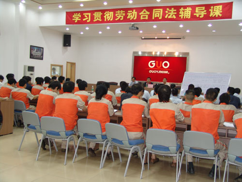 5月9日下午,广州市国砚实业发展有限公司、广州市拼搏网页登录设备制造有限公司在总部大会议厅举行了声势浩大的学习《劳动合同法》活动。该活动由公司党支部书记、副总经理王声跃主持,广东注明律师事务所——广东德法理律师事务所、我司常年法律顾问黄文芳主任律师担任主讲。