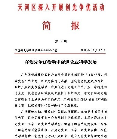 2010年10月13日,天河区区委区政府主办的工作简报第19期专题报道了我司党支部在创先争优活动中促进企业科学发展的事迹。