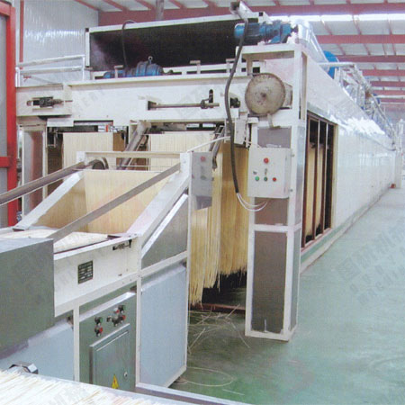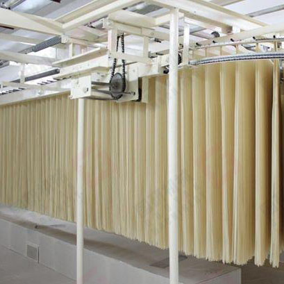 原料提升—投粉—混合计量给水—和面—熟化输送—一次压延—面片熟化—连续压片—切丝定长—给杆—挂杆上架—剪齐—烘房烘干—下架—定长切—包装